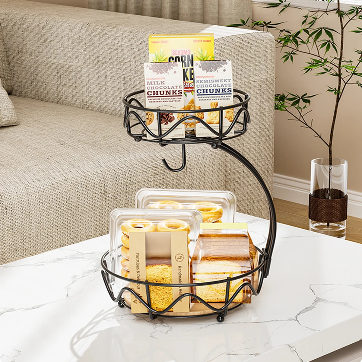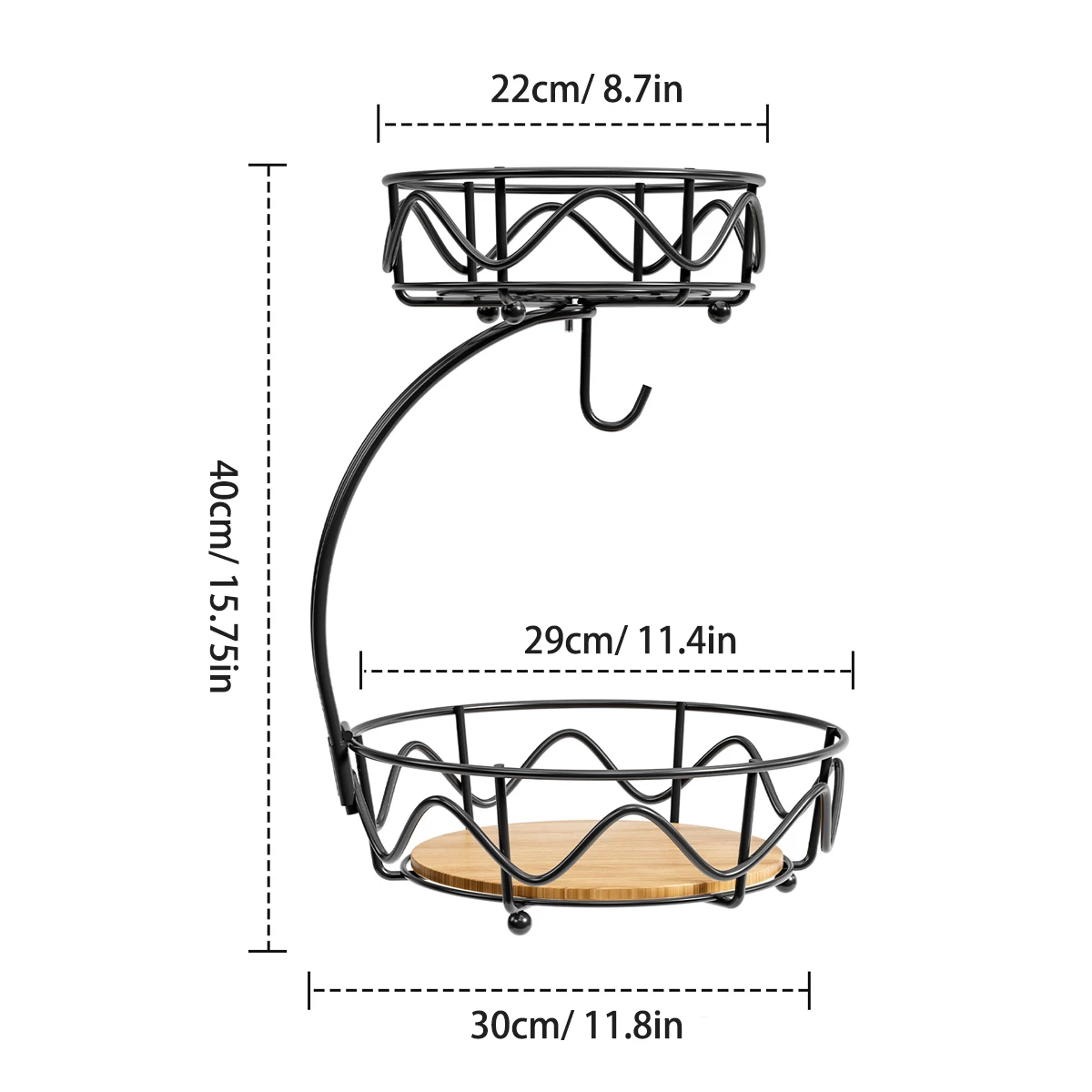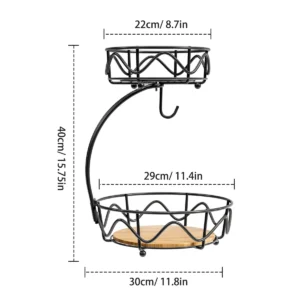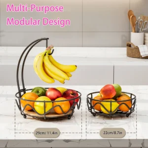 Transforme sua bancada com a nossa cesta de frutas de 2 níveis, perfeita para manter seus alimentos organizados e frescos. Com um design moderno e funcional, esta fruteira redonda possui uma base de madeira elegante e um gancho para banana que evita amassados, garantindo que suas frutas fiquem sempre em ótimo estado.