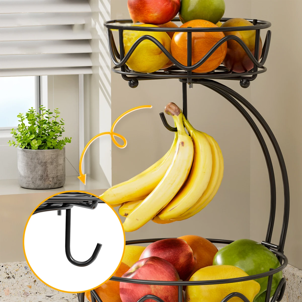 - Gancho de Banana Exclusivo: Mantenha suas bananas frescas e equilibradas, evitando amassados.