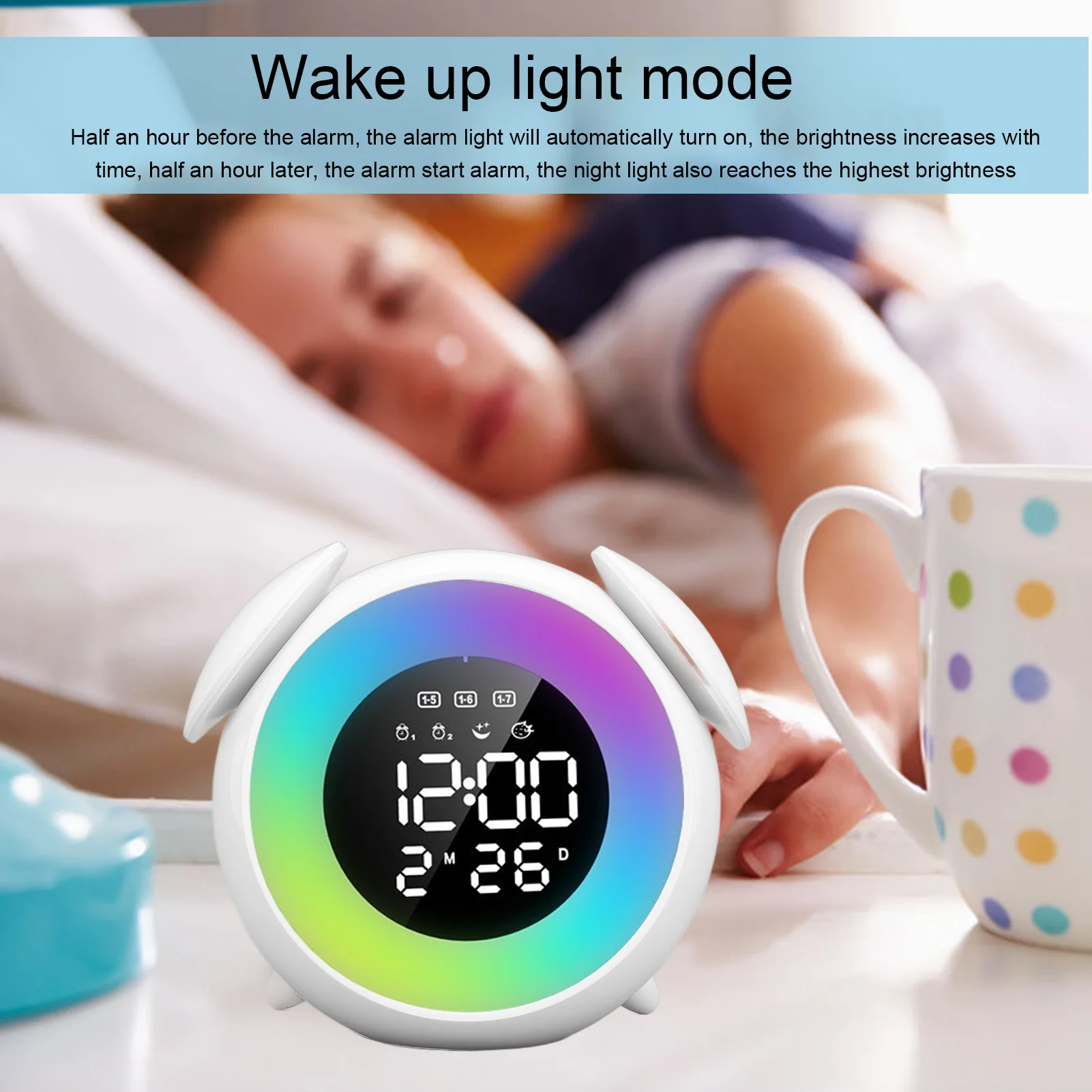 - Função de luz de acordar que simula o nascer do sol, ajudando a despertar de forma mais natural.