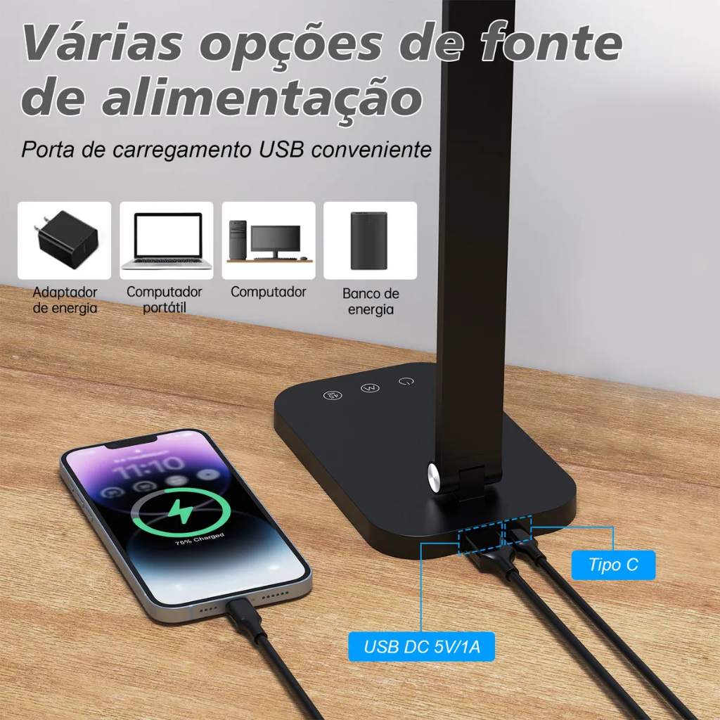 A porta de carregamento USB de 5V/2.1A e Tipo-C desta luminária pode carregar facilmente diferentes dispositivos, como celulares, tablets, leitores Kindle, entre outros. Perfeita para estudantes que precisam carregar seus dispositivos enquanto estudam, profissionais que trabalham com múltiplos gadgets e leitores ávidos que desejam uma luminária de cabeceira multifuncional.