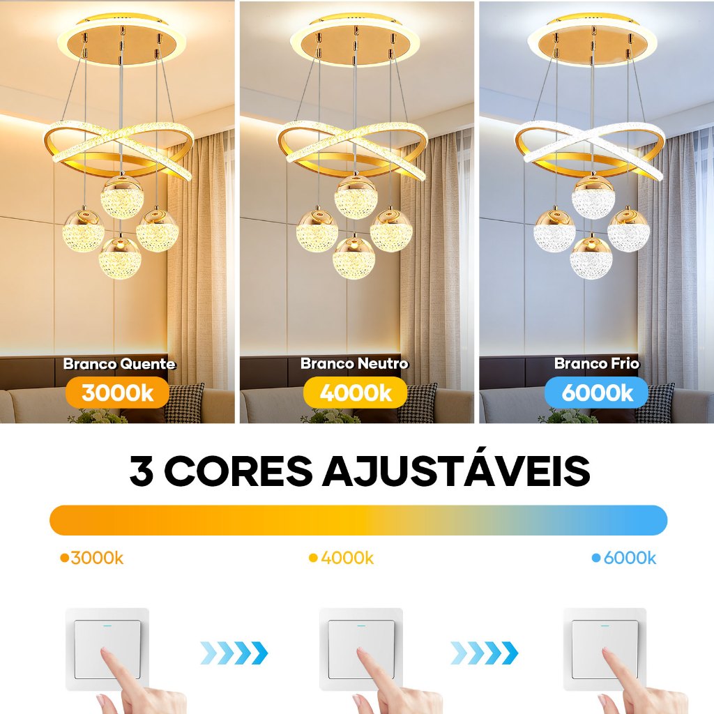 Lustre Pendente Moderno Cristal LED 3 Cores Sala Estar Jantar Quarto Luxo Luminária Teto Dourado