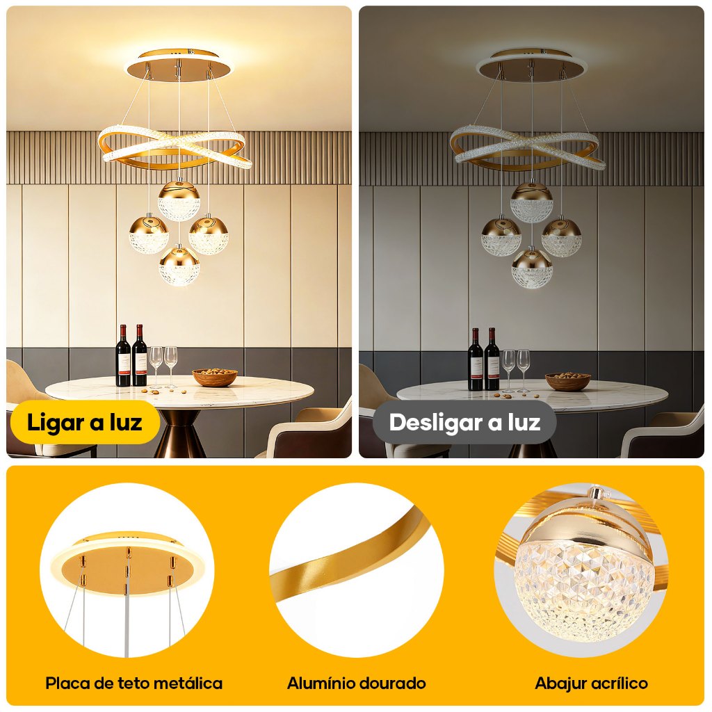 Transforme sua casa em um ambiente de revista! Este lustre não é apenas uma luminária, é uma peça central de decoração que une o design contemporâneo ao luxo do acabamento dourado.