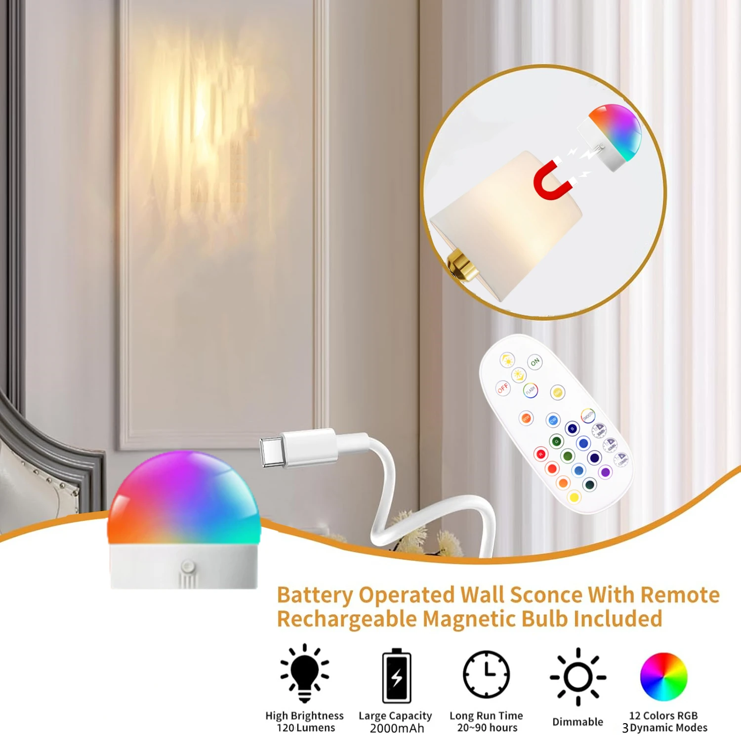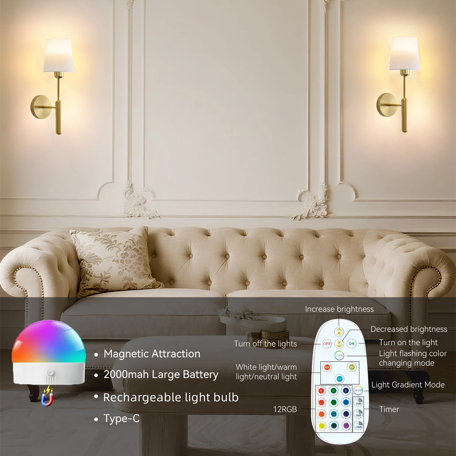 Luz de Parede Recarregável com Controle Remoto