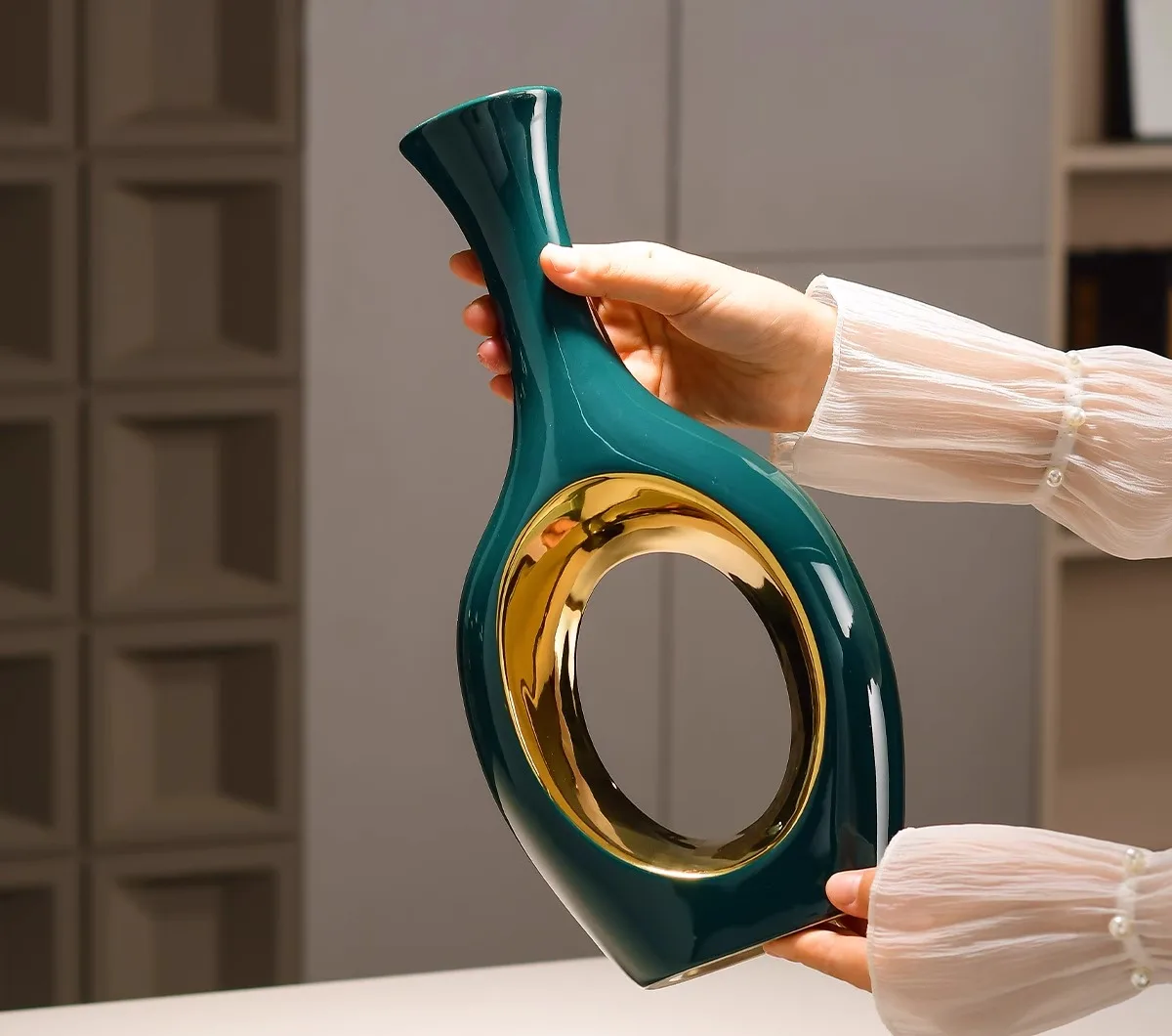 Vaso de Cerâmica Verde Banhado a Ouro